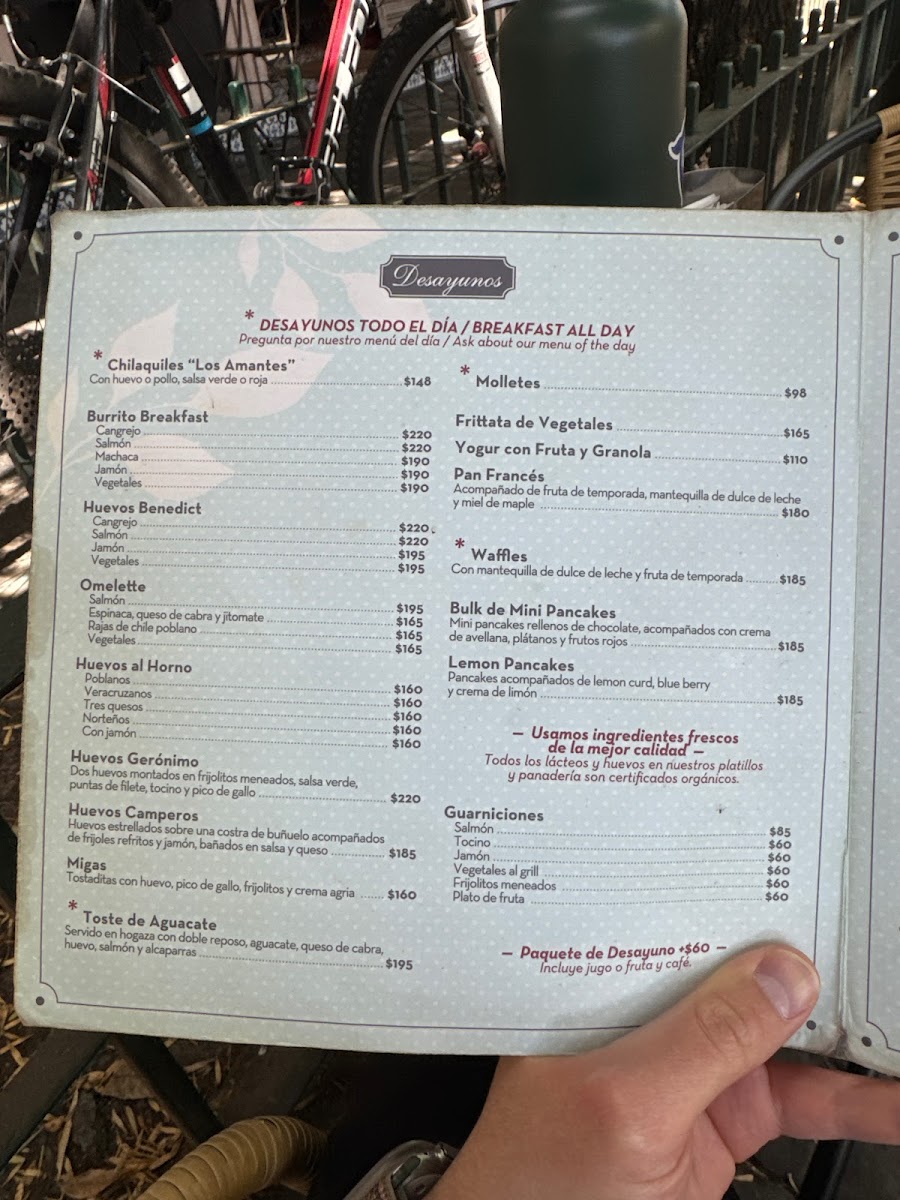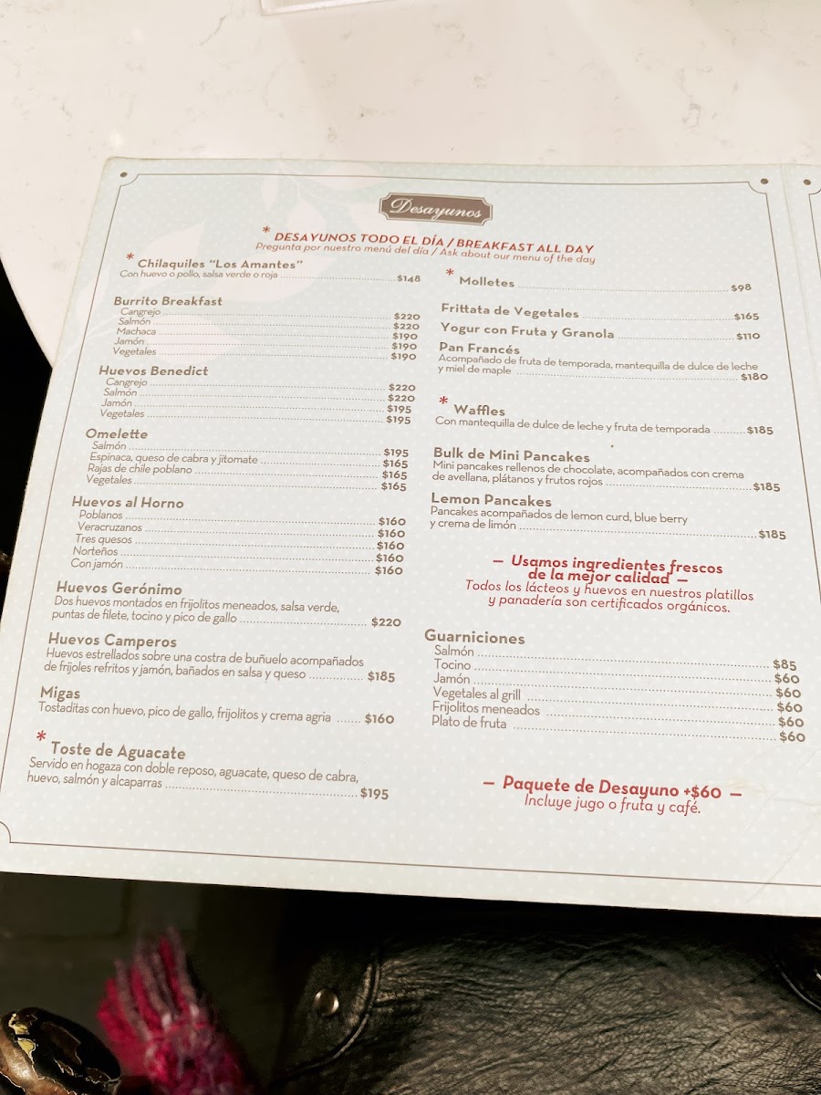 Breakfast and Light Meals cover various traditional and international dishes. These include egg preparations like Huevos Camperos and Huevos Benedictinos, chilaquiles with green or red sauce accompanied by chicken, and breakfast staples such as Migas and Grilled Cheese. Pastries and baked goods like Cuernito de Jamón and almond rolls are also available.