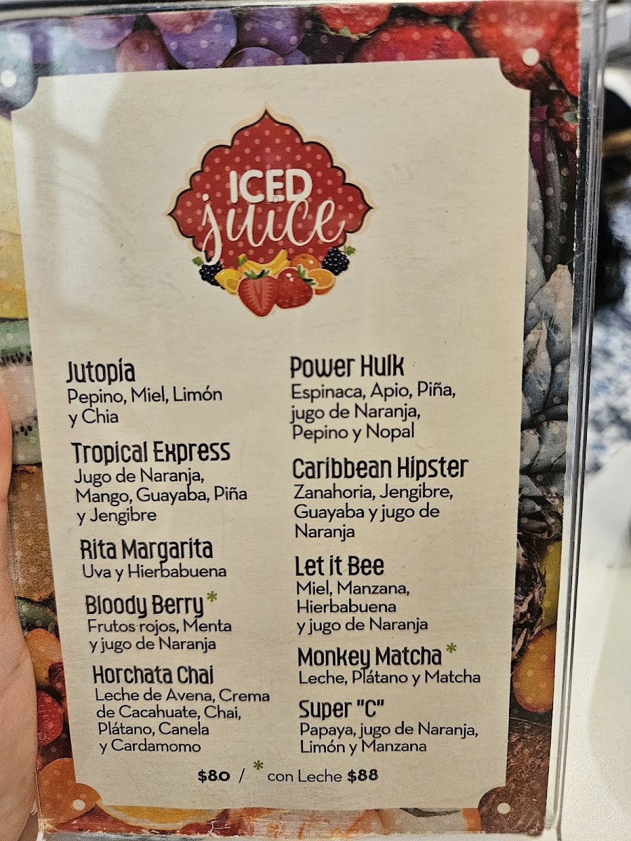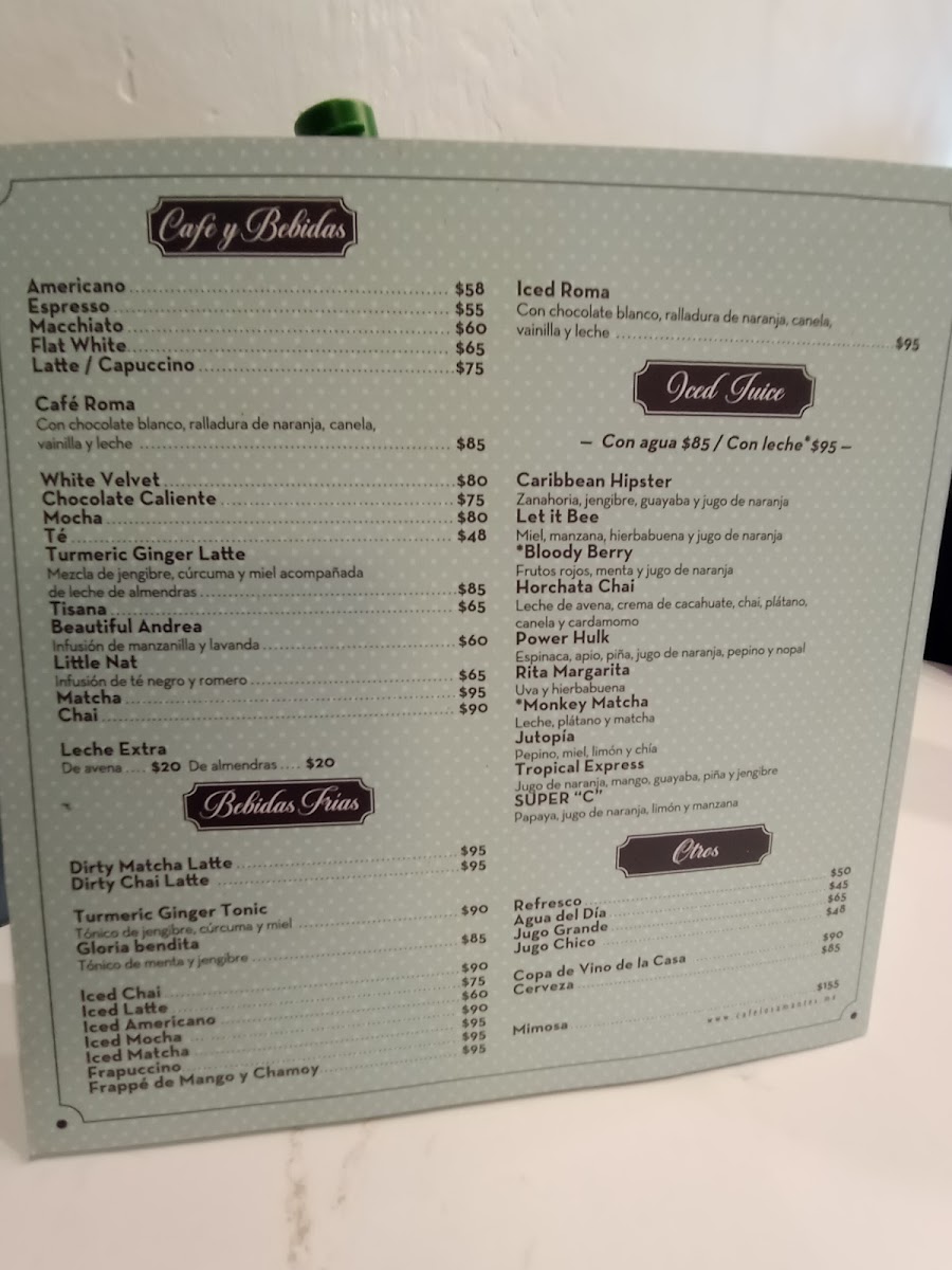 Beverages include a range of coffee-based drinks such as Flat White, Café Americano, Café Roma, and Cappuccino. In addition to coffee, there are fresh juices, aguas frescas like Agua de Piña, and specialty drinks including iced chai. Some customer feedback suggests an interest in more vegetable milk options for beverages.