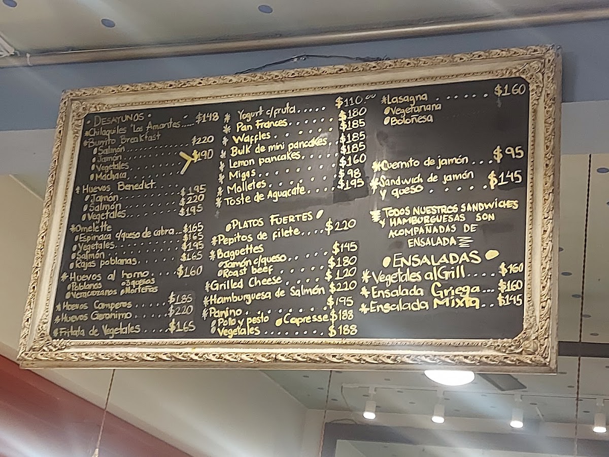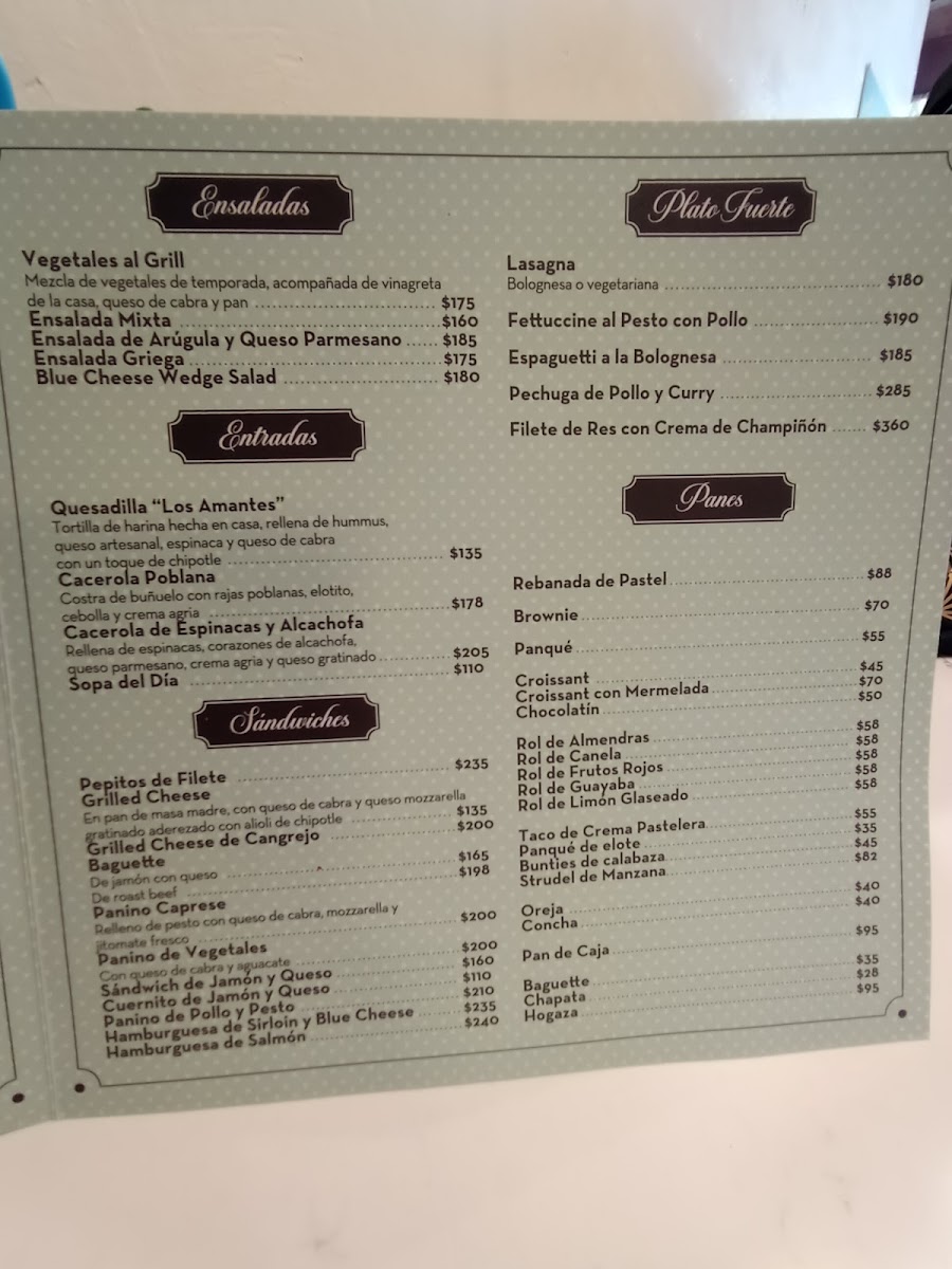 The menu at Los Amantes Cafe & Bistro features a variety of options suitable for breakfast, coffee breaks, and light meals. It is organized to offer a selection of beverages, savory dishes, and desserts, providing choices that cater to different preferences throughout the day.